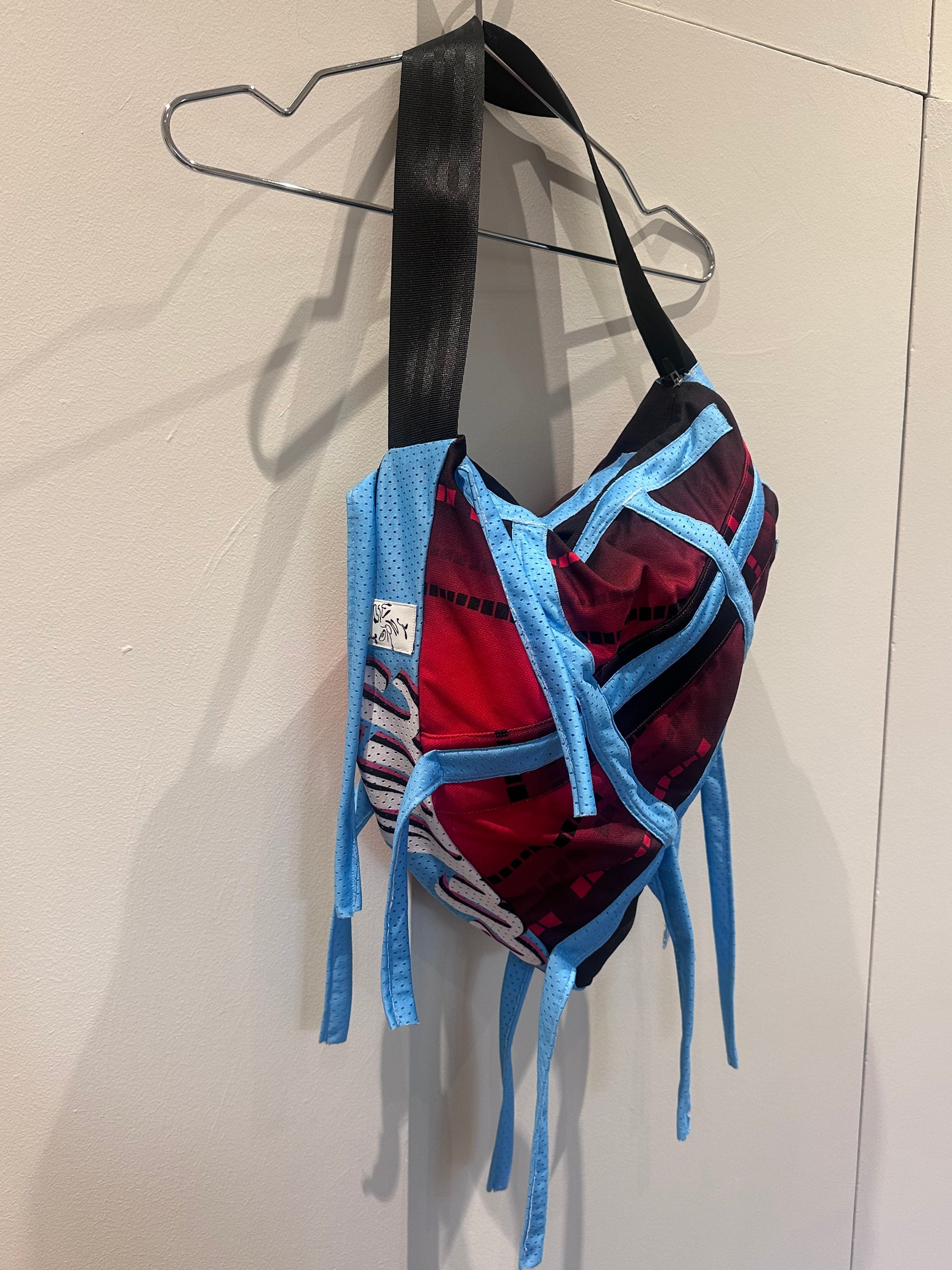 This bag is repurposed from an existing sports wear. worn as a hand bag or on the shoulder. Seat belt webbing strap is adjustable and comes with a buckle which you can unclip. Lined with thick satin for extra support. Lap top appropriate.